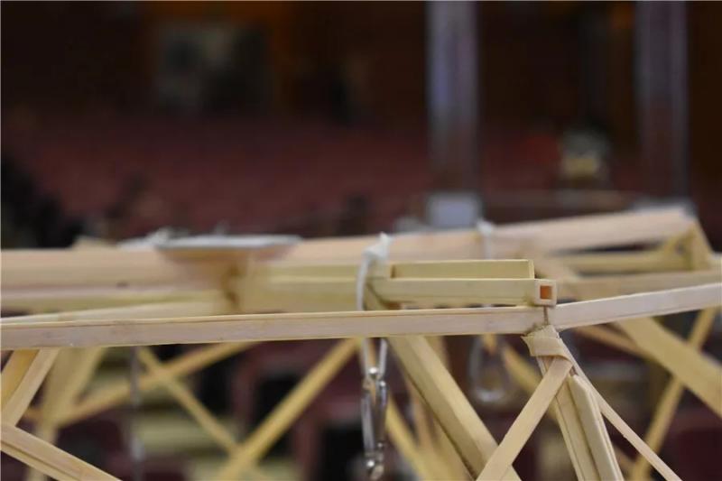 由于规则设定,比赛成绩主要与模型质量及加载质量有关。有趣的是,本次大赛最轻的模型要数“P90”,最重的为“天穹”,不幸的是,它们都没有通过全部三级加载。第12组“尼克扬楼”造型别致,评委老师一度担心其强度,但它充分利用竹条受拉能力强的特性,加载完毕时是成绩最好的一队,但随后被第13组作品“ae86”超越,经受住了全部三级加载,并斩获了一等奖。
